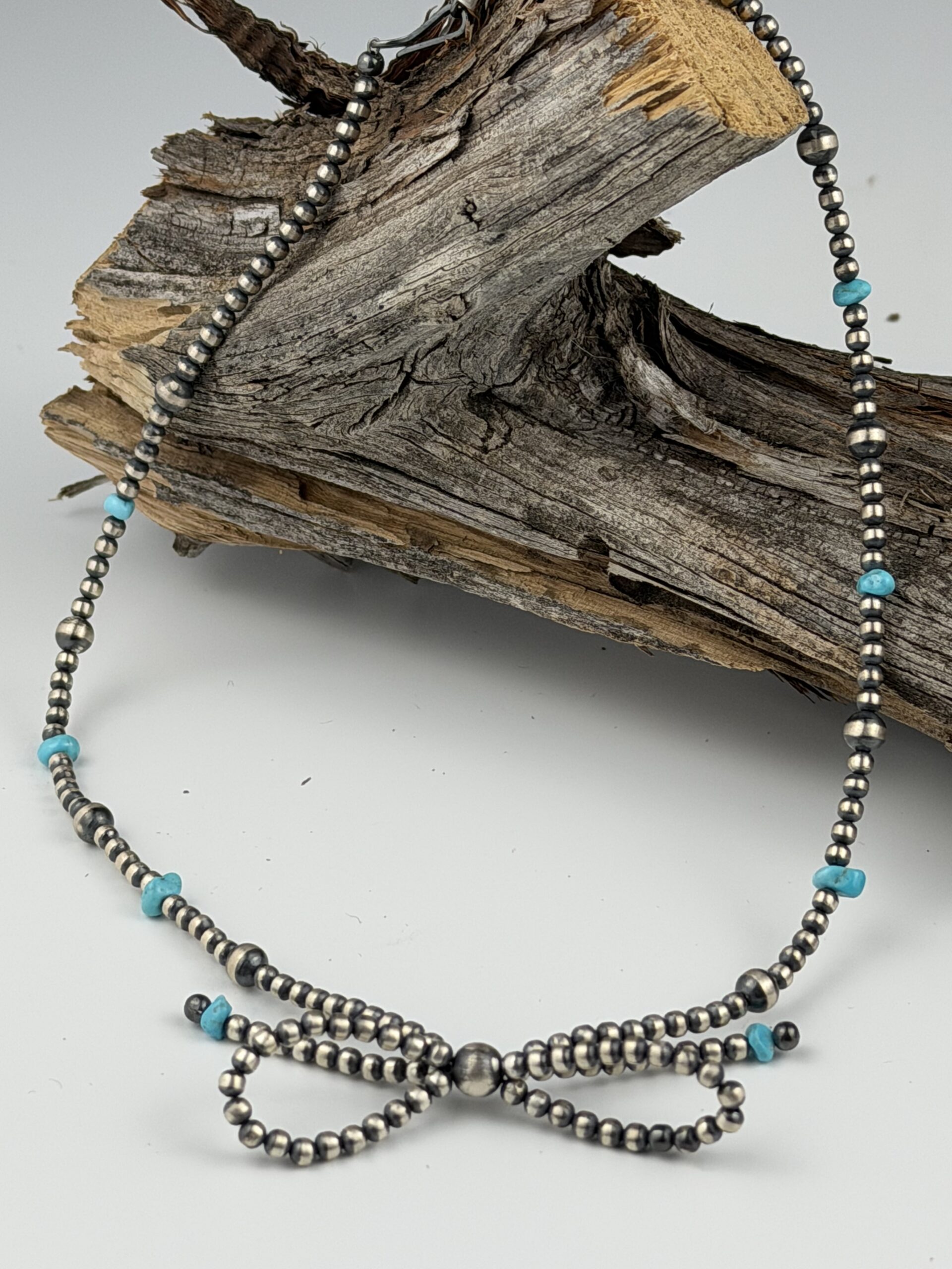 This sweet little sterling silver pearl bow necklace is a must have piece! Two sizes of pearls and eight small turquoise stones make it an eye catching necklace that will be noticed.