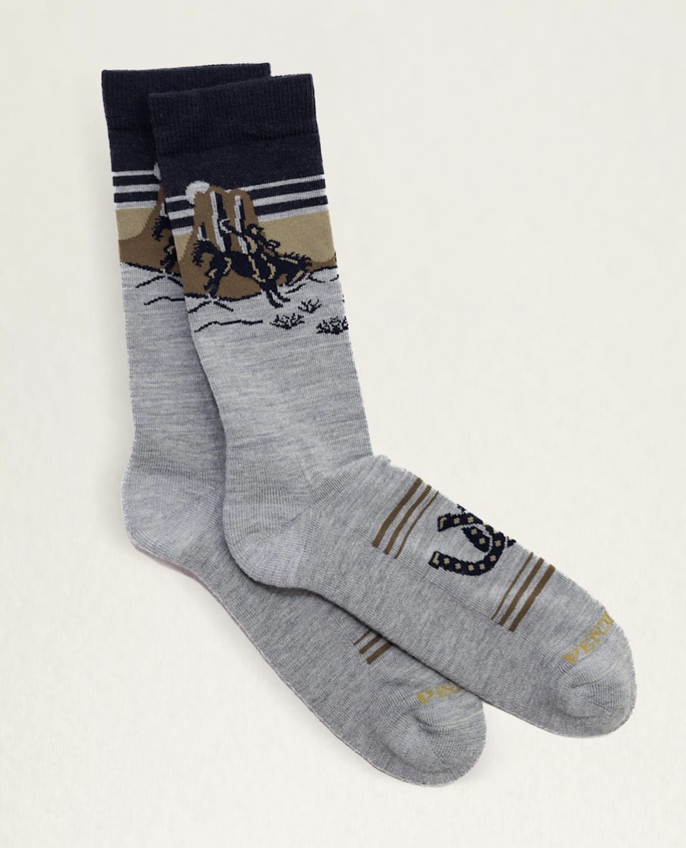 Merino wool blend Pendleton socks are durable, breathable and flat knit for year-round wear.  Unisex size larger crew socks are light weight with  reinforced heels and toes.  Cowboy Camp Socks are 53% merino wool, 44% nylon, 2% spandex and 1% polyester.  Made in USA.