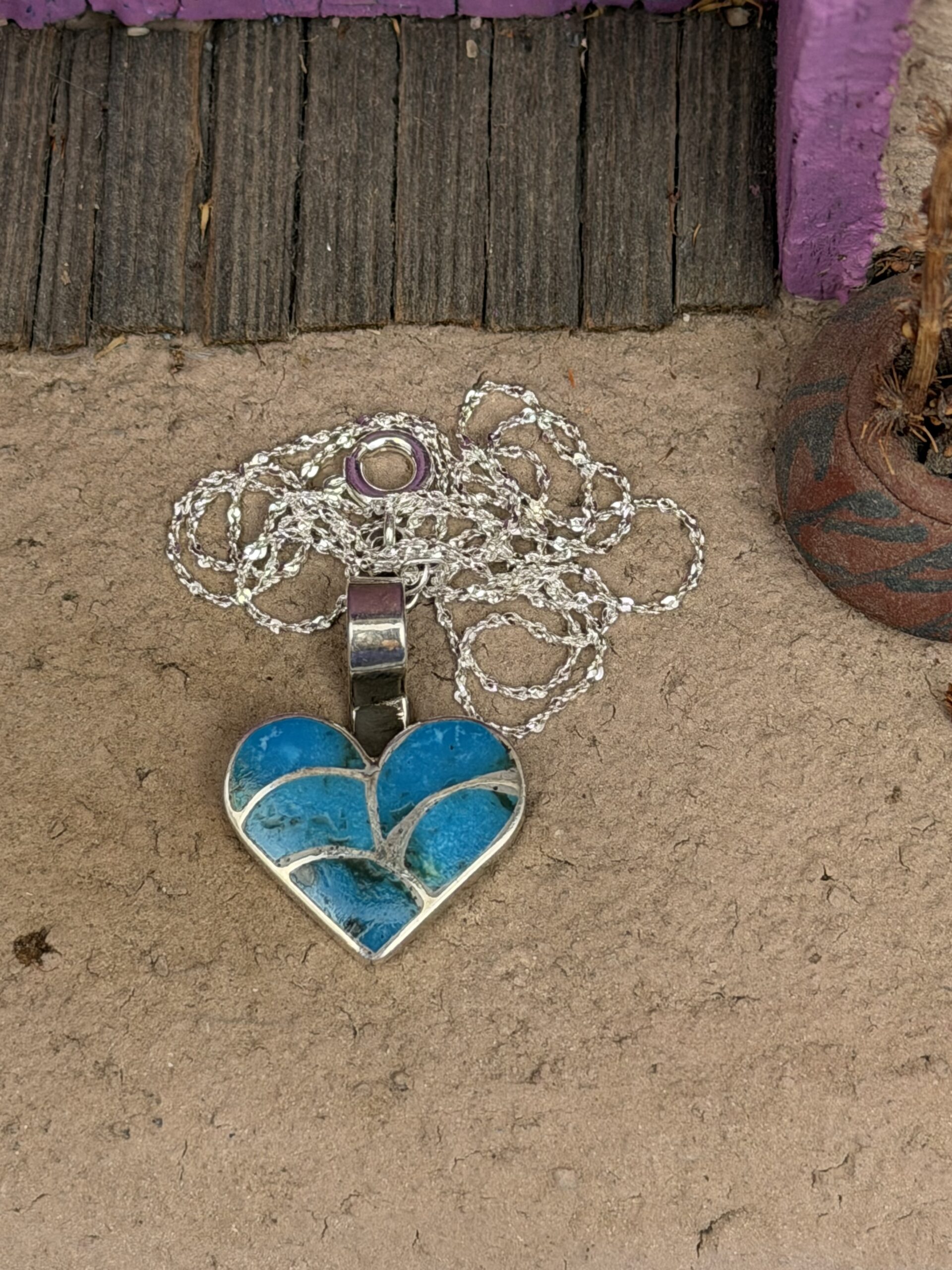 Turquoise Heart necklace is designed in a Fish Scale pattern. Â Sterling silver chain.