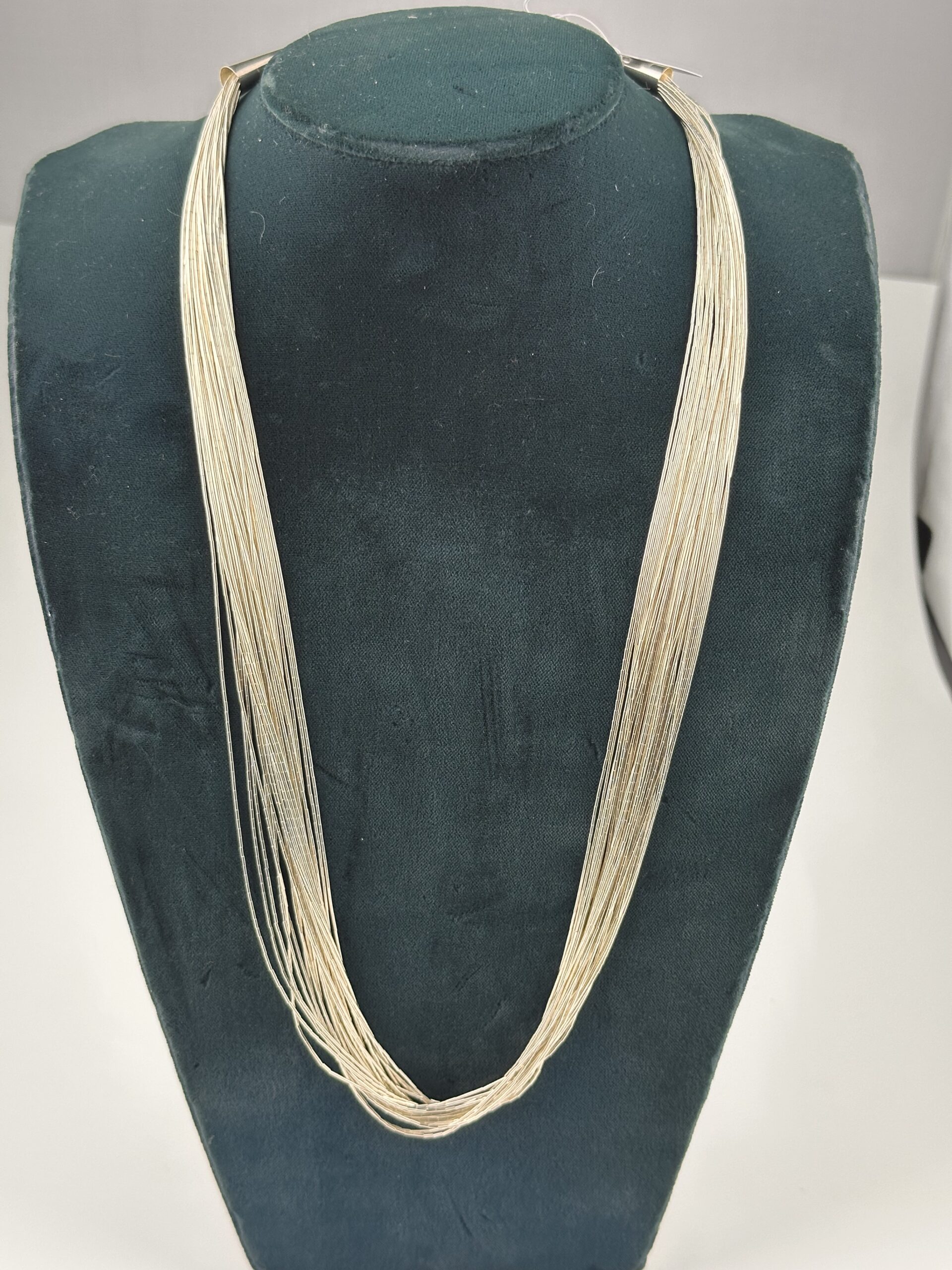 Stunning and regal, this eye catching Liquid Silver necklace is a must have piece! Â Liquid Silver is made with sterling silver heist beads which are then strung together to make a necklace of many strands. The Liquid Silver necklace pictured here is 24″ long by 30 strands thick.