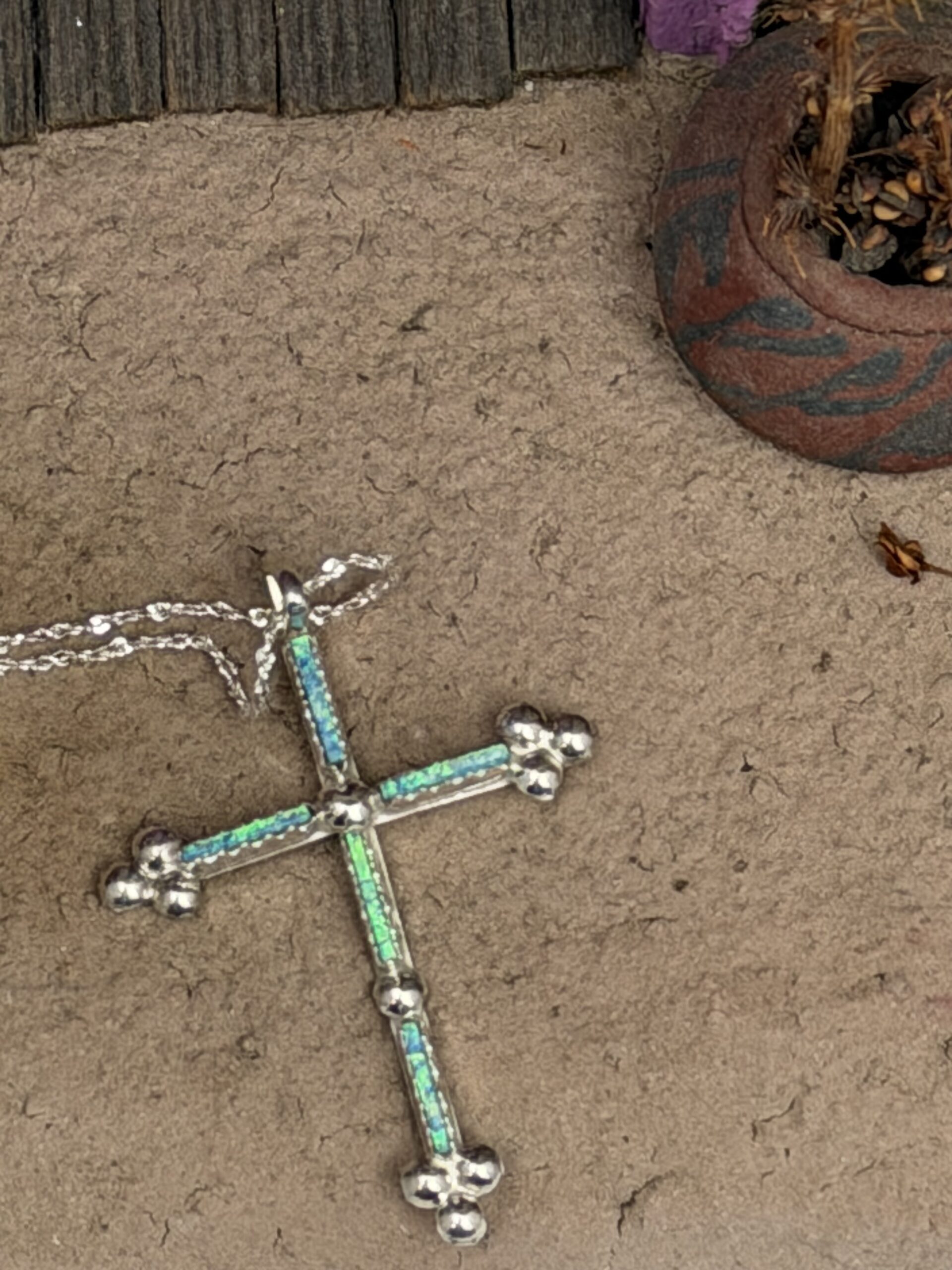 Delicate opal cross pendant has three sets of three raindrops with five long opal stones. Pendant includes an 18” sterling silver chain and measures 1 1/2” long X 1 1/8” wide. Handmade by Ashley Larte