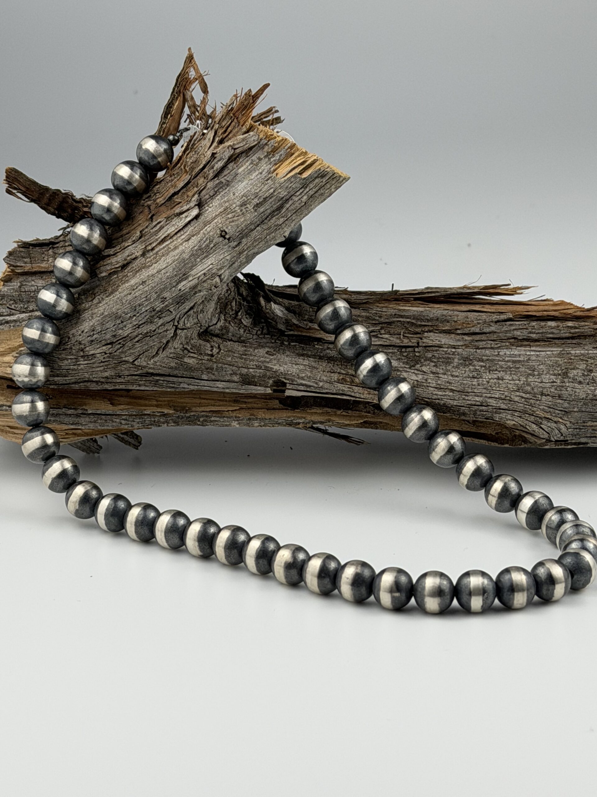 The perfect necklace!  This beautiful sterling silver pearl necklace is 16″ long.  Bead size is 8 mm durably strung and finished with a hook closure.  Machine made beads and Navajo handcrafted.